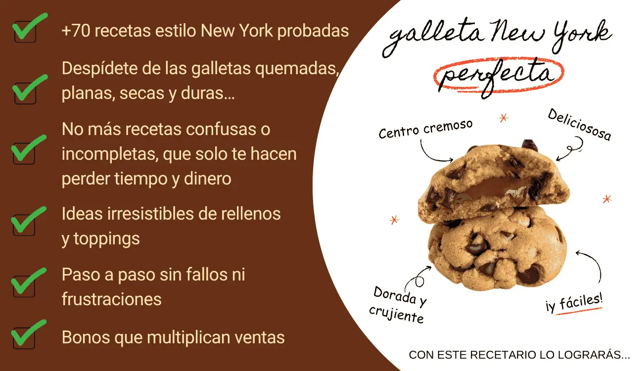Sí, porque no son solo recetas, es un método probado paso a paso, con fotos y tips claros. Incluso sin experiencia previa, desde tu primera horneada lograrás la textura gruesa, crujiente y suave de una galleta estilo New York.